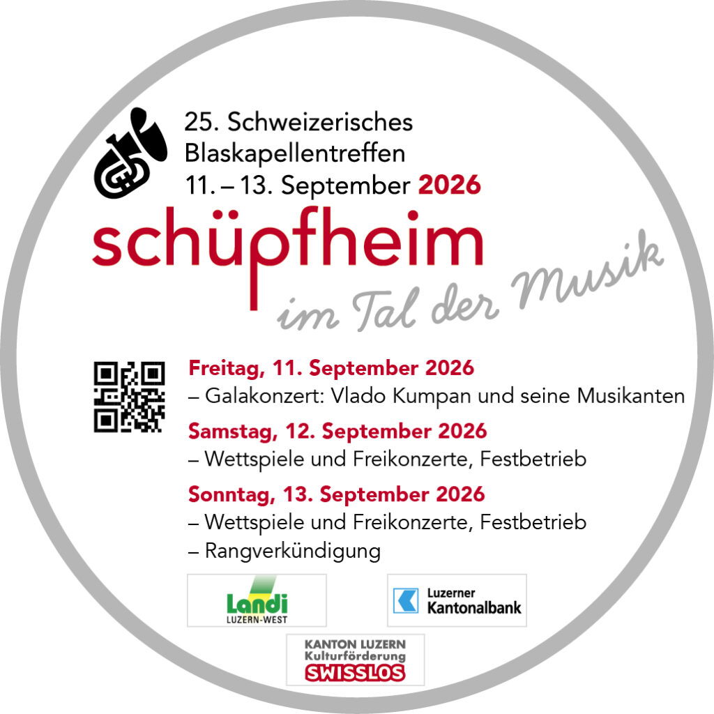 Das Schweizerische Blaskapellentreffen findet alle zwei Jahre statt und bringt am Wochenende vom 11. bis 13. September 2026 voraussichtlich etwa 40 Blaskapellen sowie etwa 10 000 Festbesucherinnen und Festbesucher aus der ganzen Schweiz zum friedlichen Musizieren und Feiern in die Unesco Biosphäre Entlebuch nach Schüpfheim.
